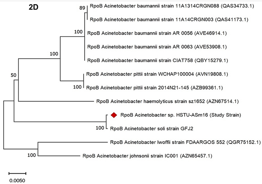 Figure 2D. rpoB gene phylogenetic tree of the strain Acinetobacter sp. HSTU-Asm16.