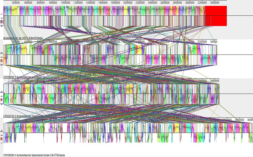 Chromosome assemblies of the four samples were reordered according to M63 with Mauve and aligned by using progressive Mauve. The locally collinear blocks (LCB) of the genomes of three nearest strains namely Acinetobacter baumannii strain. Acinetobacter soli strain TO-A JPC and Acinetobacter bohemicus sp. with Acinetobacter sp. HSTU-Asm16 strain was inspected using Progressive Mauve (Figure 4). The block outlines of Acinetobacter sp. HSTU-Asm16 genome encompassed a sort of sequence that is homologous to part of other genomes compared. It is assumed that the homologous LCBs are internally free from genomic rearrangement of genomes compared. In fact, the LCB in the genome of Acinetobacter sp. HSTU-A Sm16 is connected by lines to similarly colored LCBs in the genomes of, Acinetobacter baumannii, Acinetobacter soli, Acinetobacter bohemicus, respectively. The boundaries of LCBs of Acinetobacter sp. HSTU-Asm16 and other strains taken comparison are generally considered as breakpoints of genome rearrangements. As seen in Figure 4, the LCBs of the Acinetobacter sp. HSTU-Asm16 genome are near exactly matched with the LCBs of genomes taken for comparison. In addition, the reshuffling or rearrangements of sort of sequences are found in various LCBs compared to the LCBs of other nearest strains genomes. These results suggested that the Genome of the Acinetobacter sp. HSTU-Asm16 strain is quite varied from its nearest strains, which indicates its evolutionary properties.