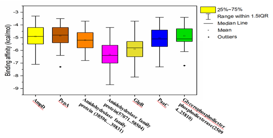 Figure 5 illustrates the virtual screening of pesticide-degrading model proteins from Acinetobacter sp. HSTU-Asm16, based on their predicted binding affinities (kcal/mol). Virtual screening, employing molecular docking simulations, estimates the interaction strength between ligands and target proteins, with more negative binding affinity values indicating stronger interactions. Seven model proteins were analyzed: AmpD, PepA, two Amidohydrolase family proteins (38596–39831 and 57071–58504), GlpB, PaaC, and Glycerophosphodiester phosphodiesterase (25094–25810). Among these, the Amidohydrolase family protein (57071–58504) exhibited the strongest median binding affinity (-6.4 kcal/mol), suggesting the formation of the most stable protein–pesticide complexes. The other Amidohydrolase protein (38596–39831) had a median binding affinity of -5.2 kcal/mol. GlpB and PaaC demonstrated moderate binding affinities of -6.0 kcal/mol and -5.6 kcal/mol, respectively, consistent with their known roles in aromatic compound and glycerophosphodiester degradation. AmpD and PepA displayed median affinities of -5.0 kcal/mol and -4.8 kcal/mol, respectively, with PepA showing a notable outlier at -7.4 kcal/mol, indicating potential strong interactions with specific pesticides. Similarly, Glycerophosphodiester phosphodiesterase exhibited an outlier at -7.2 kcal/mol. Overall, these results identify the Amidohydrolase family protein (57071–58504) as the most promising candidate for pesticide degradation in Acinetobacter sp. HSTU-Asm16. The observed strong outliers for PepA and Glycerophosphodiester phosphodiesterase highlight additional proteins that may contribute to efficient pesticide breakdown, warranting further experimental validation.