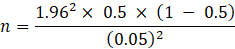 The critical value (z) included as 1.96 for a 95 % confidence level. We made the best assumption for calculating the sample size, the prevalence estimate would be 50%. The precision limit or proportion of sampling error (d) is usually considered to be 5% confidence limit.