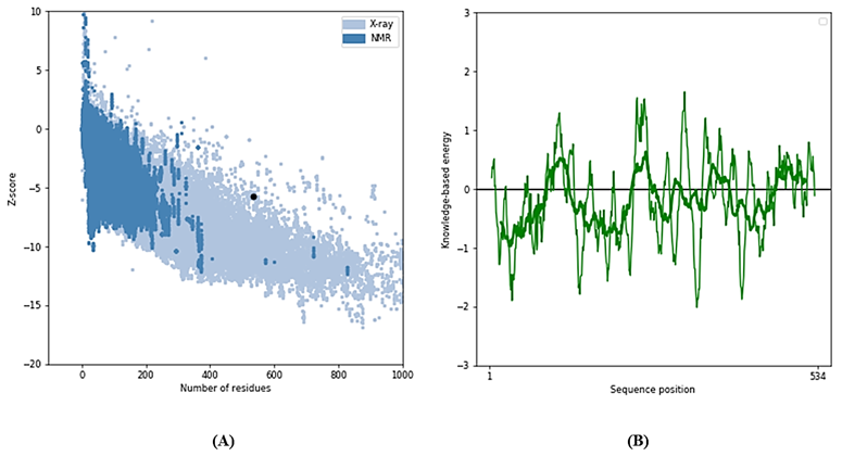 According to the SAVES PROCHECK, 95.5% of the residues of amino acids were situated among a Ramachandran's top choice areas, whereas 3.7% were positioned in additional authorized regions (Figure 4). The ERRAT score of the I-TASSER predicted model is 92.381. According to the SWISS-MODEL, MolProbity gives I-TASSER's HP a value of 1.52, Ramachandran favored region of 97.18%, a QMEAN value of -3.36, and a QMEANDisCo Global of 0.77±0.05 (Supplementary Figure 1). We examined the structure and decided on the I-TASSER model for further investigation. According to ProSA, the predicted Z-score of the HP model is given a negative figure by I-TASSER: -5.71 (Supplementary Figure 2).